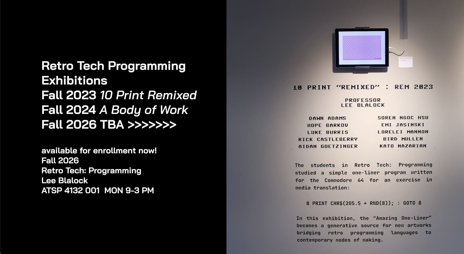 This is a studio course that will make use of vintage technologies available through the ATSP Retro Lab. Students will learn early programming languages for use on some of the first home computers (C64, Apple 2E, Atari 2600) while deepening their study of creative computing. No programming skills are necessary, though experience with newer programming languages will only enrich your understanding of the content. Students will also have access to early 1970s synthesizers and image processing systems to combine techniques and create multimedia projects throughout the semester.